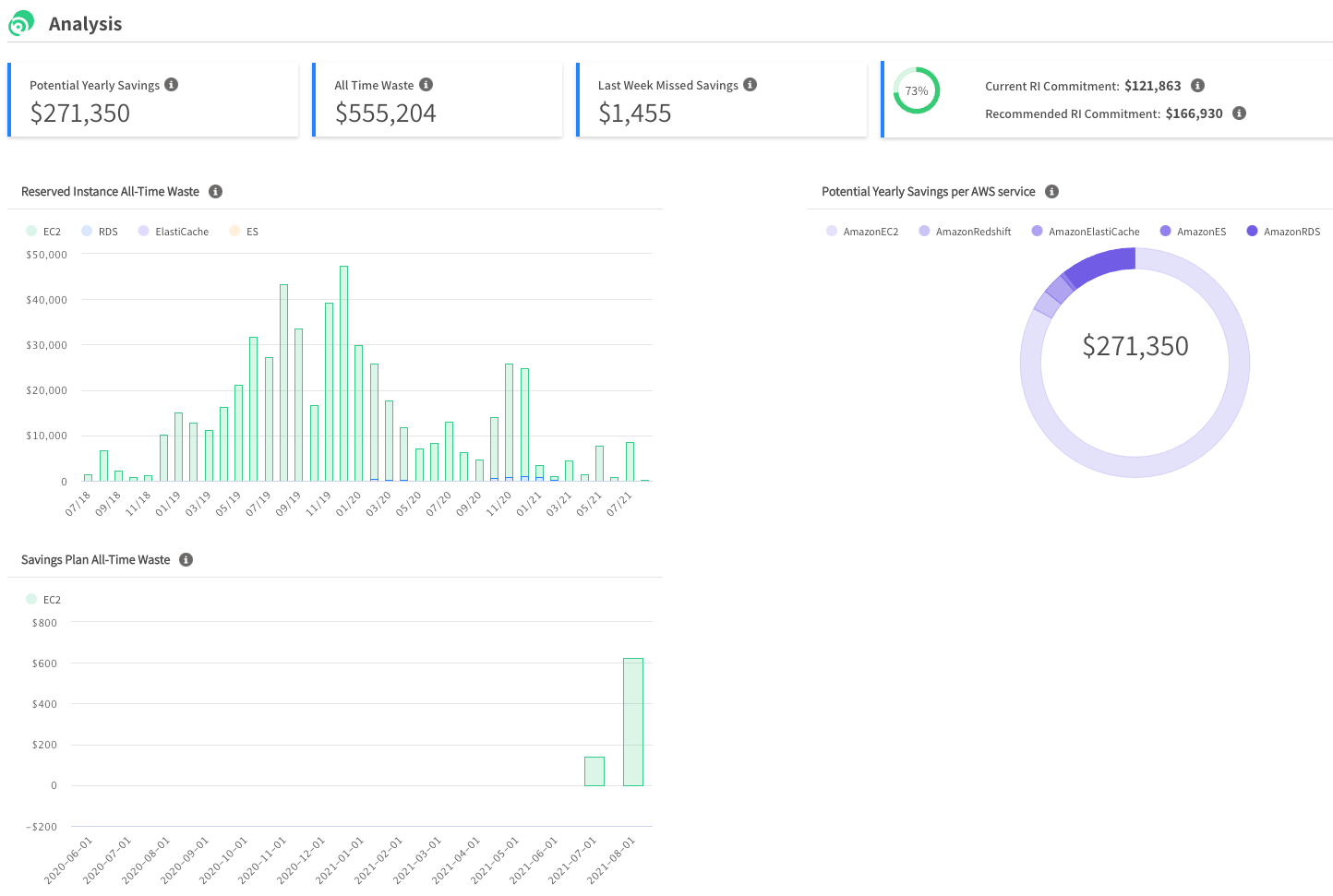 The Dashboard’s Analysis page (AWS) appears to new customers who have connected an AWS Management account to Spot, but have not yet committed to an Eco RI and Savings Plan management strategy.